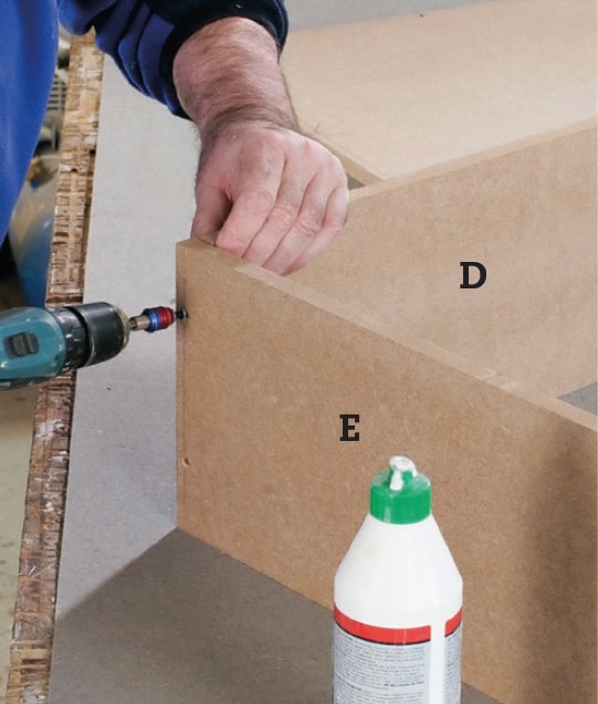 Lådsidorna E fästs på bakstycket D med lim och 3,5 x 40 mm skruvar. Eftersom bakstycket ligger mellan sidorna är det nödvändigt att försänka skruvarna så att de inte skrapar emot sockeln.