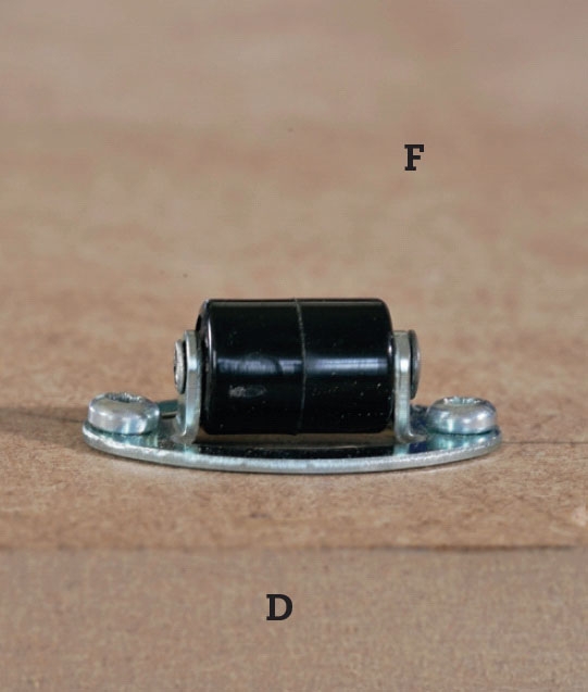 Lådbottnen F sätts fast på sidorna E och bakstycket D med lim och skruvar. När sidor och bakstycke justeras längs kanten på lådbottnen hamnar de automatiskt i rät vinkel.