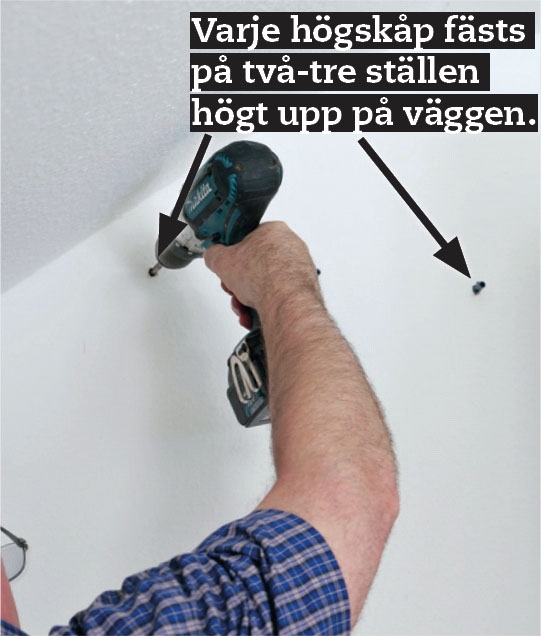 Skåpen ska förankras med två-tre skruvar i väggen. Borra högt upp i skåpen genom bakstycket så att det blir märken på väggen. Ta bort skåpen och borra i väggen för pluggar. Eller fäst med skruvar.
