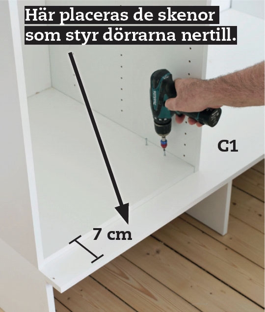 Styrskenorna K skruvas fast på sockelns toppskiva C1, när de har skjutits in i spåren under varje dörr. Se till att dörrarna hänger lodrätt och skruva fast skenorna med 3,5 x 15 mm kullerförsänkta skruvar.