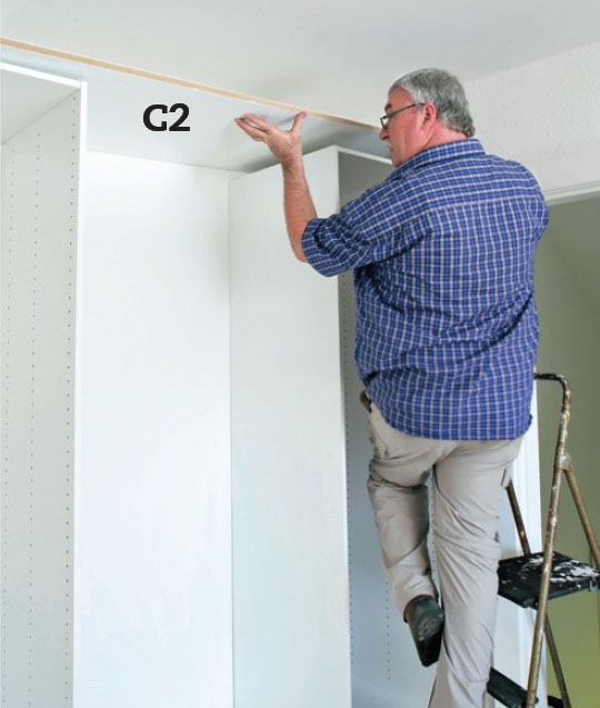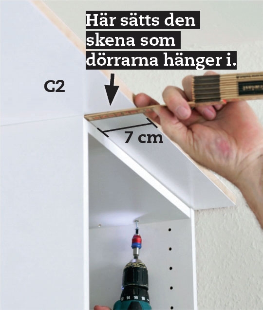 Toppskivan C2 skruvas fast med 3,5 x 30 mm skruvar. Även toppskivan ska sticka ut 7 cm så att skenan till skjutdörrarna kan monteras.