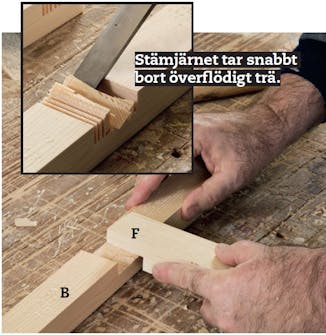 När du sågat ut för samtliga bladfogar och stämt bort träet, gör du en provmontering av ramen. Även om ramen inte syns utifrån, så ska fogarna passa så att ramen blir stabil. När allting är som det ska, limmas delarna ihop.