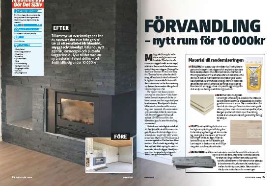 BRASKAMINEN har klätts med natursten - svart skiffer som håller värmen och - bryter av mot de stora, vita ytorna i rummet. Stenarna har skarvats i långa ”remsor” som sätts upp med kakelfix på braskaminen. När stenarna har satts upp är braskaminen klar, eftersom det inte ska fogas mellan den här typen av plattor. Naturstenen var det dyraste materialet under renoveringen.