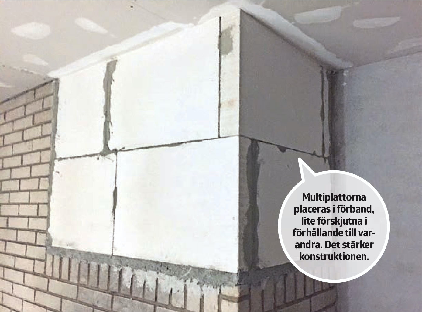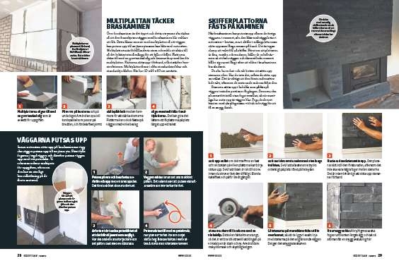 Över braskaminen är det öppet och detta utrymme ska täckas så att den framskjutna väggen med braskaminen blir enklare att klä. Detta klarar man av med multiplattor så att väggen kan putsas upp till en jämn yta som kan kläs med natursten. Multiplattorna är förhållandevis stora och enkla att skära till så det behövs inte så många för att fylla ut hålet. Plattorna skärs till med en grovtandad såg och limmas ihop med lim för multiplattor. Plattorna sätts upp i förband, vilket stärker konstruktionen. Multiplattor finns i olika standardstorlekar och standardtjocklekar. Här har 10 x 40 x 60 cm använts.