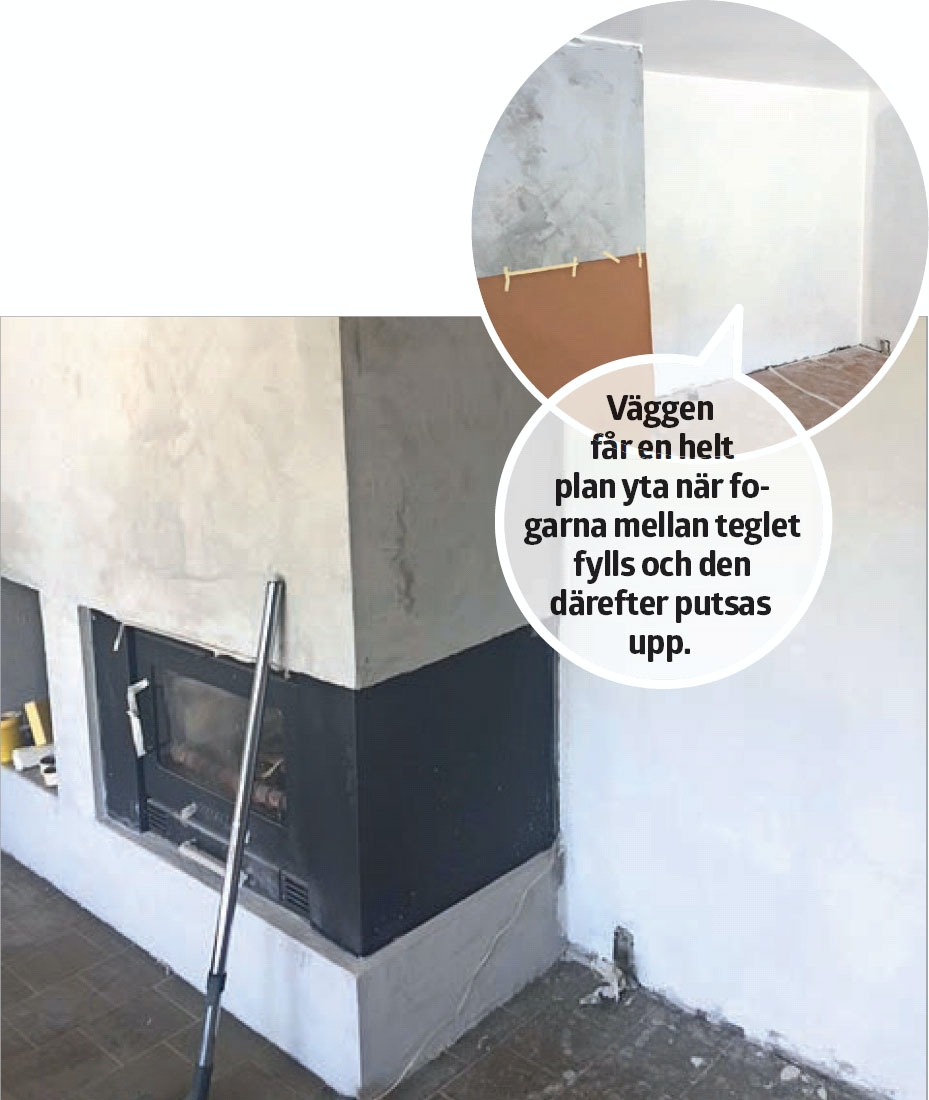 VÄGGARNA har putsats upp och målats vita. Först fylldes fogarna mellan teglet så att väggarna fick en plan yta som bara behövde ett putsskikt innan de till sist målades. Här har ett finkornigt putsbruk (7/7 %) använts, eftersom det fanns en hel del kvar av det här materialet från ett annat projekt. Ska du köpa nytt material är multiputs lämpligt, eftersom det är lätt att arbeta med och kan användas på många olika underlag. Resultatet blir en snygg, robust och putsad vägg. Multiputs är dock en dyrare lösning än ett finkornigt putsbruk.