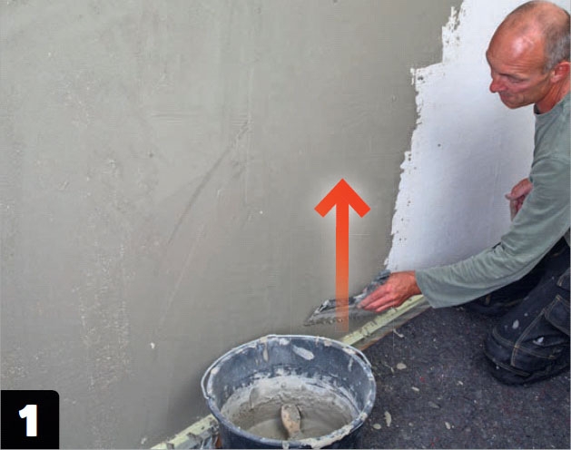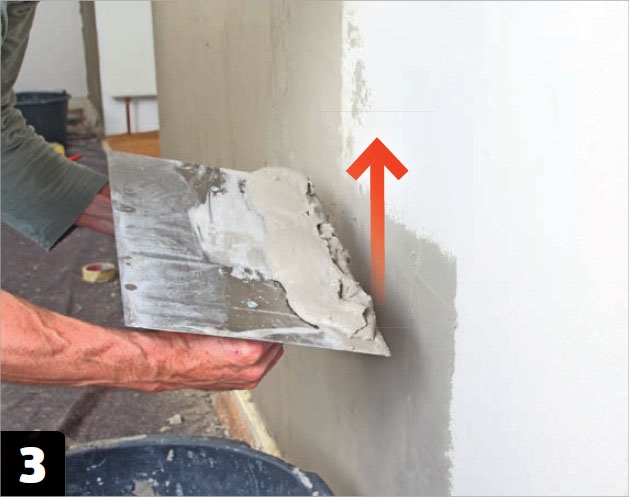 Putsen påförs och bearbetas nerifrån och upp med en bred spackel. Det första skiktet ska vara lite tunt.