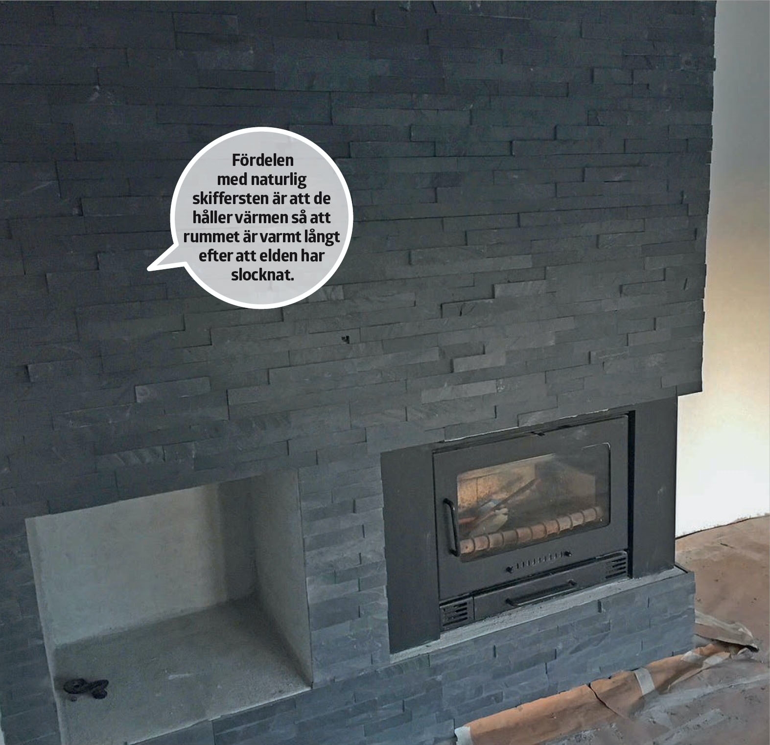 När braskaminen har putsats upp såsom de övriga väggarna i rummet, ska den kläs med väggplattor i natursten - bruten, svart skiffer i avlånga bitar som sätts upp som långa remsor på band. Det är ingen slump att valet föll på skiffer. Förutom att plattorna är fina, rustika och moderna, håller de också värmen så att hela väggen och därmed hela rummet håller sig varmt långt efter att elden i braskaminen har slocknat.