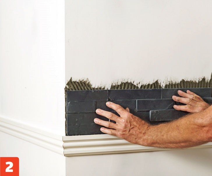 Sätt fast den första raden med sten längs trälisten. Se till att alla stenarna trycks ordentligt på plats i fixet på hela ytan.