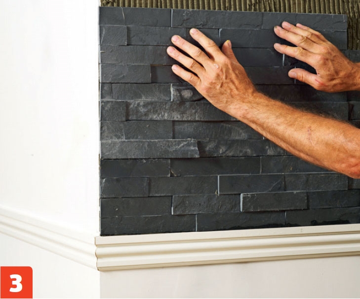 Stenarna sätts upp i kakelfix som påförs på väggen i mindre portioner åt gången. Stenarna ska placeras tätt intill utan fogar emellan, så när samtliga har satts upp är väggen klar. Foga dock runt kanten med akrylfogmassa vid tak och vägg för att få en snygg finish.