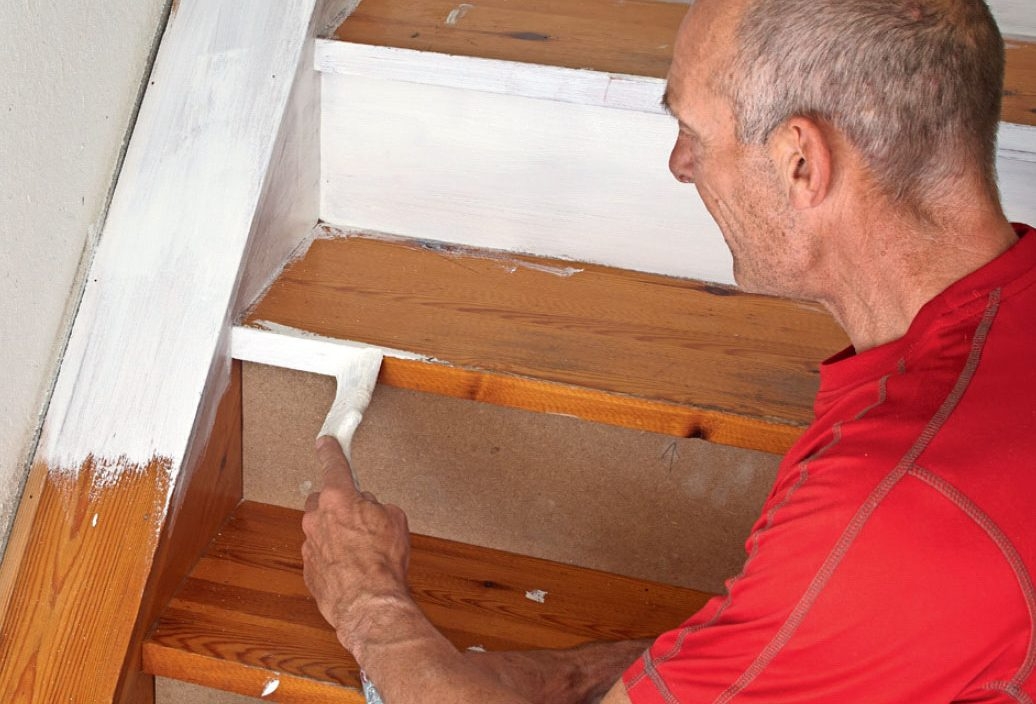 Trappans furu har gulnat med åren. Vi målar den vit både på bjälkarna och de lodräta sättstegen. Detsamma gör vi med undersidan av trappan till andra våningen. Ta bort alla täcklister, kantlister och liknande från alla steg och bjälkar, både på källartrappan och på undersidan av trappan till den andra våningen. Tvätta stegen och bjälkarna noggrant med grundrengöring innan du målar.