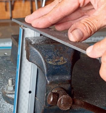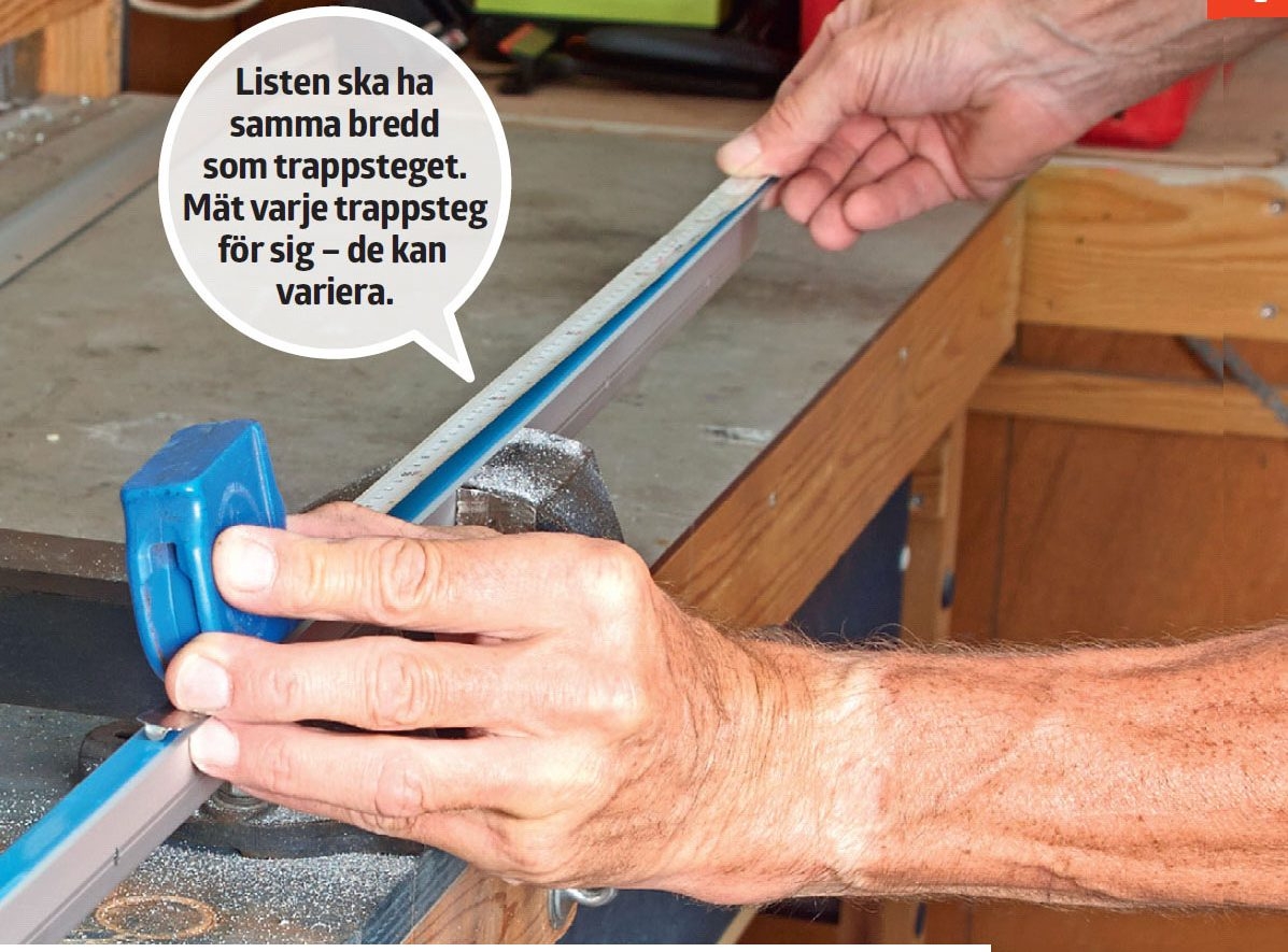 Mät upp aluminiumlisten i längder som motsvarar trappstegens bredd. Spänn fast listen medan du sågar med bågsågen.