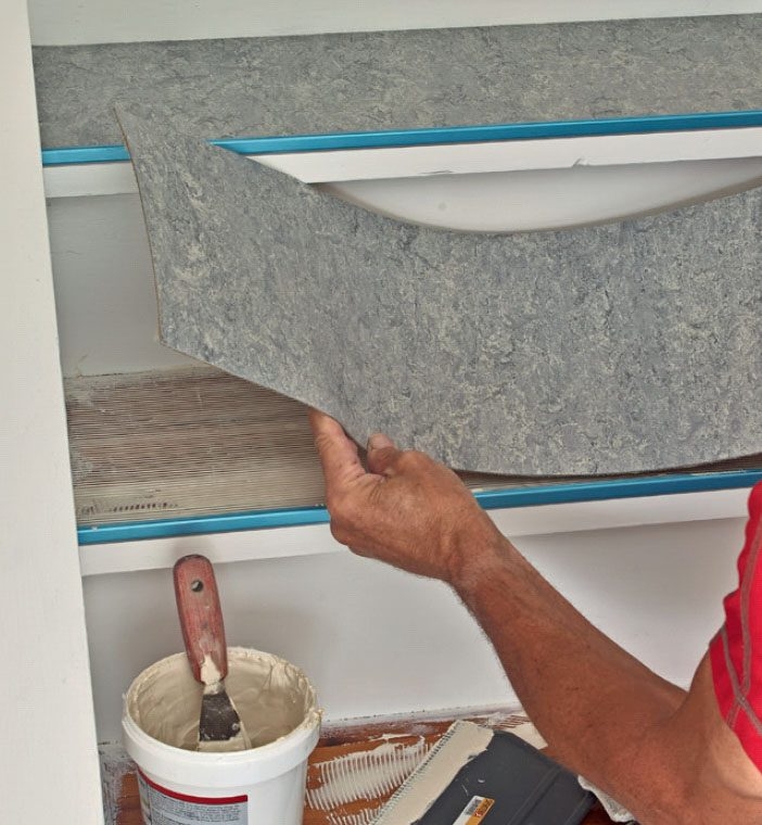 Stryk på golvlim på trappsteget. Stryk på limmet med en spackel så att det blir ett enhetligt, tunt skikt. Aluminiumlisternas blå plasttejp skyddar listerna, så låt tejpen sitta kvar under tiden.