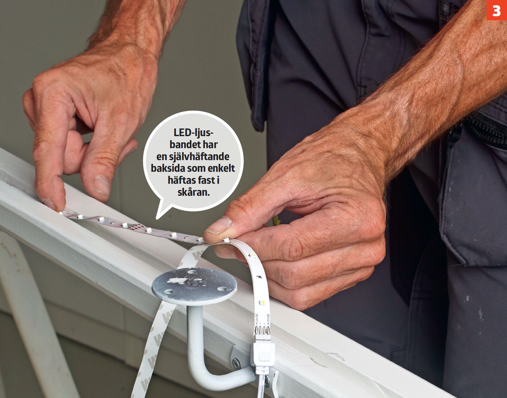 Ljusbandet limmas fast när trappräcket har målats vitt. Tryck fast den självhäftande remsan med lysdioder i botten på skåran. Börja från en ände och korta av ljusbandet så att det passar i längden.