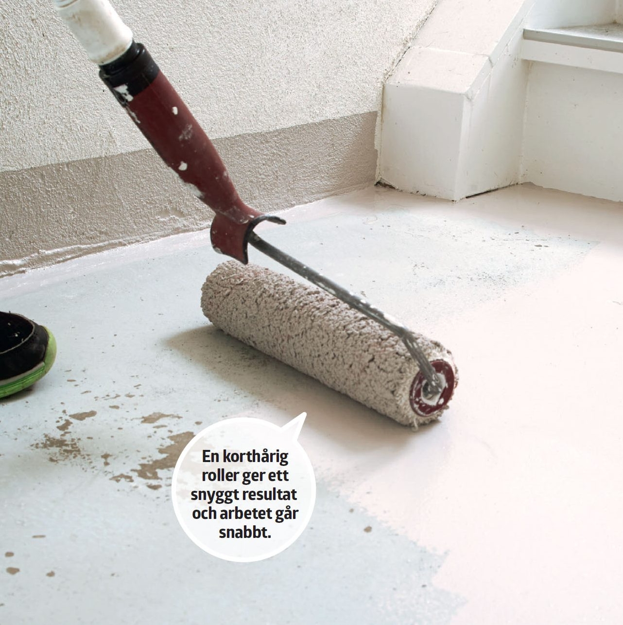 Mät först kanterna längs väggar och trappa. Vi har valt en tvåkomponents, vattenbaserad epoxifärg (ska användas inom en timme).