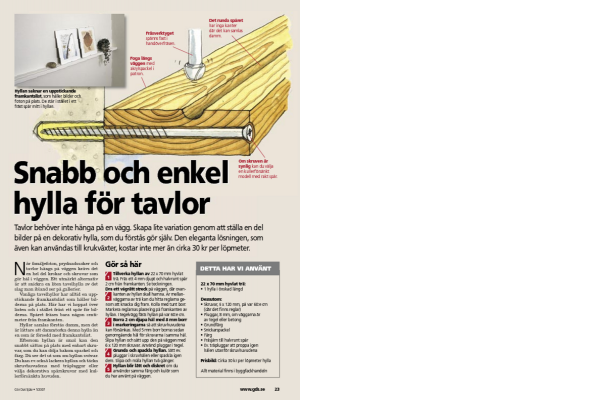 Tillverka hyllan av 22 x 70 mm hyvlat trä. Fräs ett 4 mm djupt och halvrunt spår 2 cm från framkanten. Se teckningen.