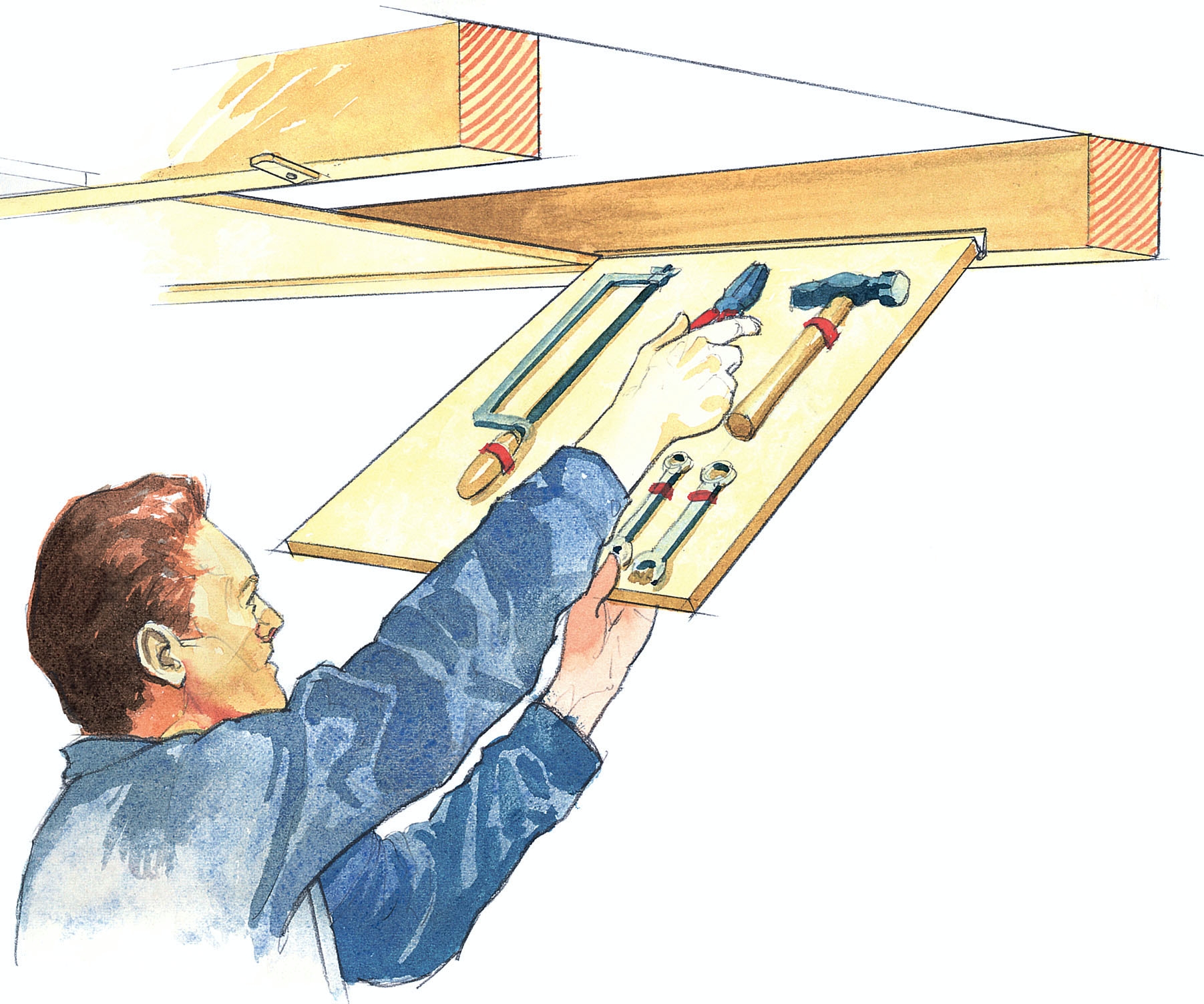 När det är trångt i verkstan gäller det att tänka konstruktivt. Det är kanske så högt till tak att du kan sänka taket lite med ett antal reglar? Då kan du utnyttja utrymmet mellan reglarna. Du kan t.ex. fästa en del av dina verktyg på en skiva, som du sätter fast med gångjärn. Då fäller du bara ner skivan när du ska ha fatt i verktygen. Men fäst dem ordentligt på skivan så at de inte ramlar ner i huvudet på dig när du fäller ner skivan. Om det är möjligt kan du använda verktygshållare som är avsedda för verktygstavlor.