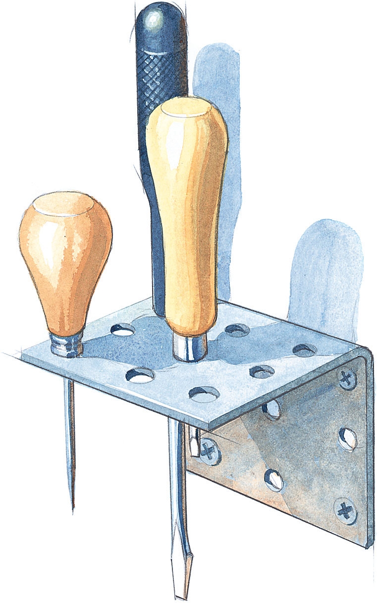 Ett byggbeslag som detta kan fungera som en perfekt hållare för skruvmejslar, sylar och andra liknande verktyg. Det enda du ska göra är att borra upp hålen i den ena fliken till lagom dimension anpassad efter verktygen. Du ska naturligtvis inte använda idén till förvaring av vassa verktyg, för de skadas av metallen.