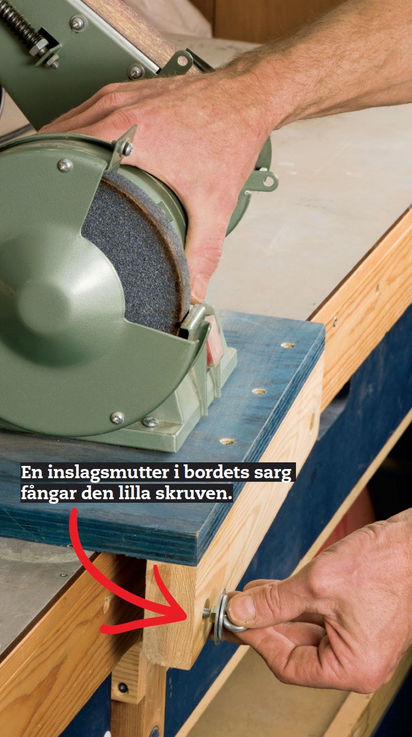 De statonära maskinerna har skruvats fast på stabila skivor, som i sin tur monteras på arbetsbordet. I den list som sitter i framkanten av skivan finns ett hål för en maskinskruv (skruvögla). Den sticks in genom hålet och fästs i sargen på arbetsbordet i en inslagsmutter.