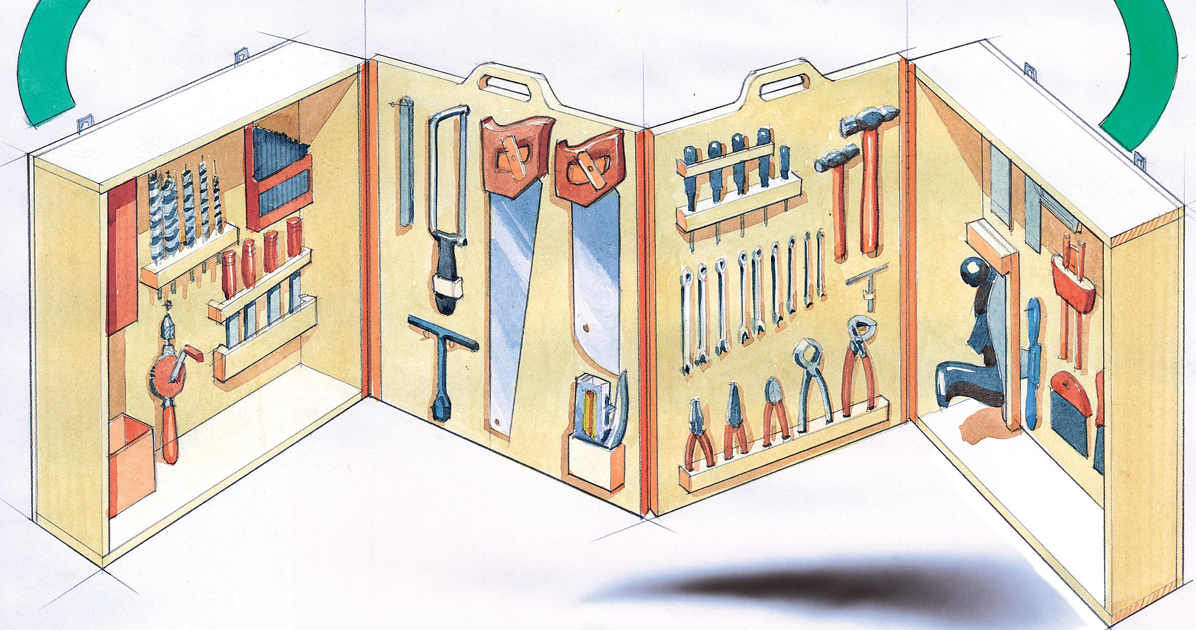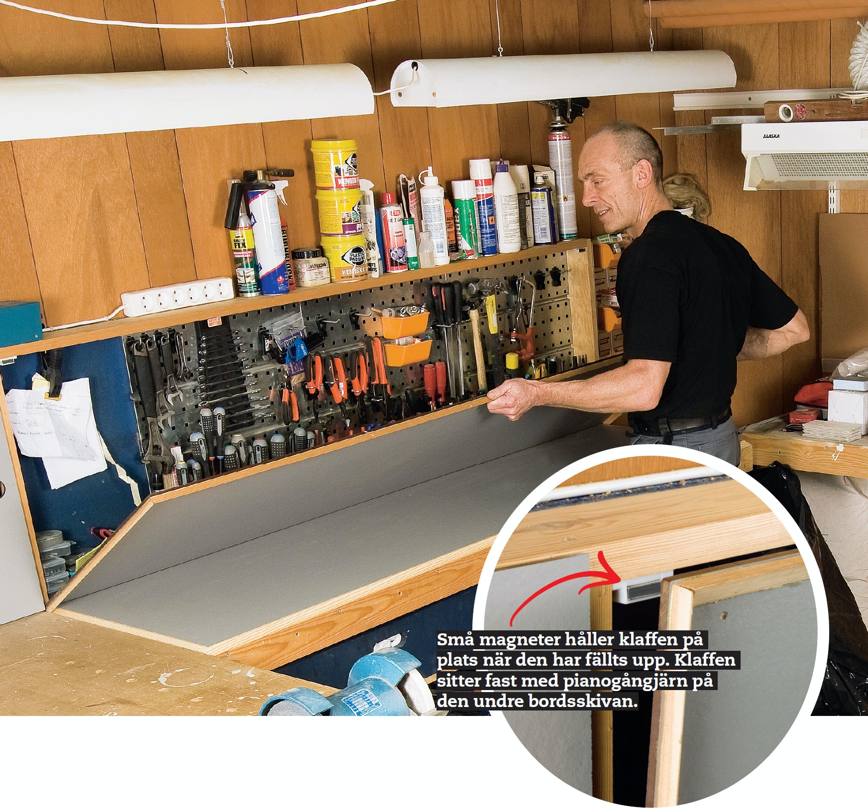 Eftersom det gäller att utnyttja alla utrymmen blir det rätt snabbt fullt på väggarna med hyllor, skåp och andra förvaringsmoduler. Var ska man då sätta verktygstavlan? Jo, den tillverkas som en låda innehållande en utfällbar verktygstavla. Vår modell består av ett antal skivor som kan få plats inuti lådan. Skivorna sitter ihop med varandra med pianogångjärn och man kan ha många skivor i ett skåp. Men tänk på vikten, för även om skivorna är rätt tunna så väger ju verktygen en hel del. Och vitsen med denna lösning är bland annat att man ska kunna ta med sig hela verktygstavlan.