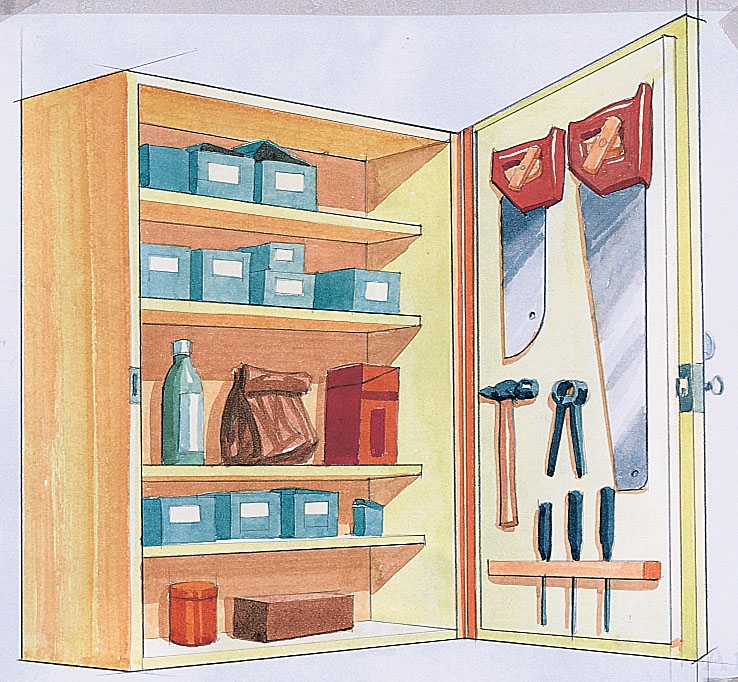 Skåpen i verkstan rymmer en hel del, och när man snabbt vill städa kan man bara stuva undan sakerna i skåpen. Men du kan få plats för flera saker om du också utnyttjar insidan av skåpsdörren. Ibland kräver det att du kortar av hyllplanen för att kunna stänga dörren.