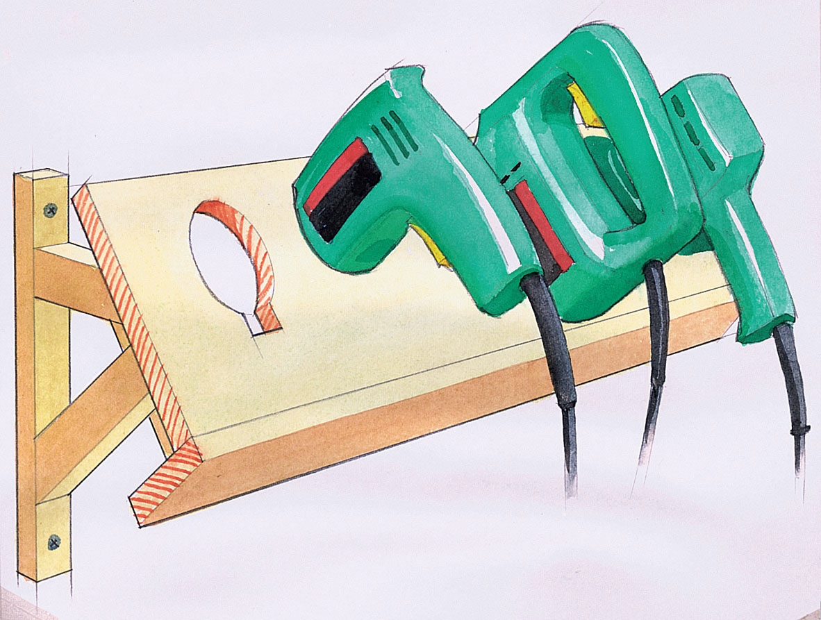 I stället för att fylla upp på dina hyllor med väskor som innehåller maskiner av olika slag, kan du packa upp maskinerna och montera handtag och tillbehör. Därefter gör du en hållare som den på teckningen, där maskinerna får sina fasta platser. Varje hål utformas nämligen efter respektive maskin.