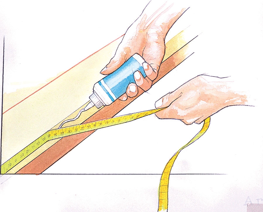Om du limmar fast ett måttband längs framkanten på ditt arbetsbord så går det snabbt att kolla om arbetsstycket har rätt storlek – utan att behöva ta fram tumstocken. För att mätbandet inte ska slitas eller skadas kan du lackera det några gånger med klarlack.