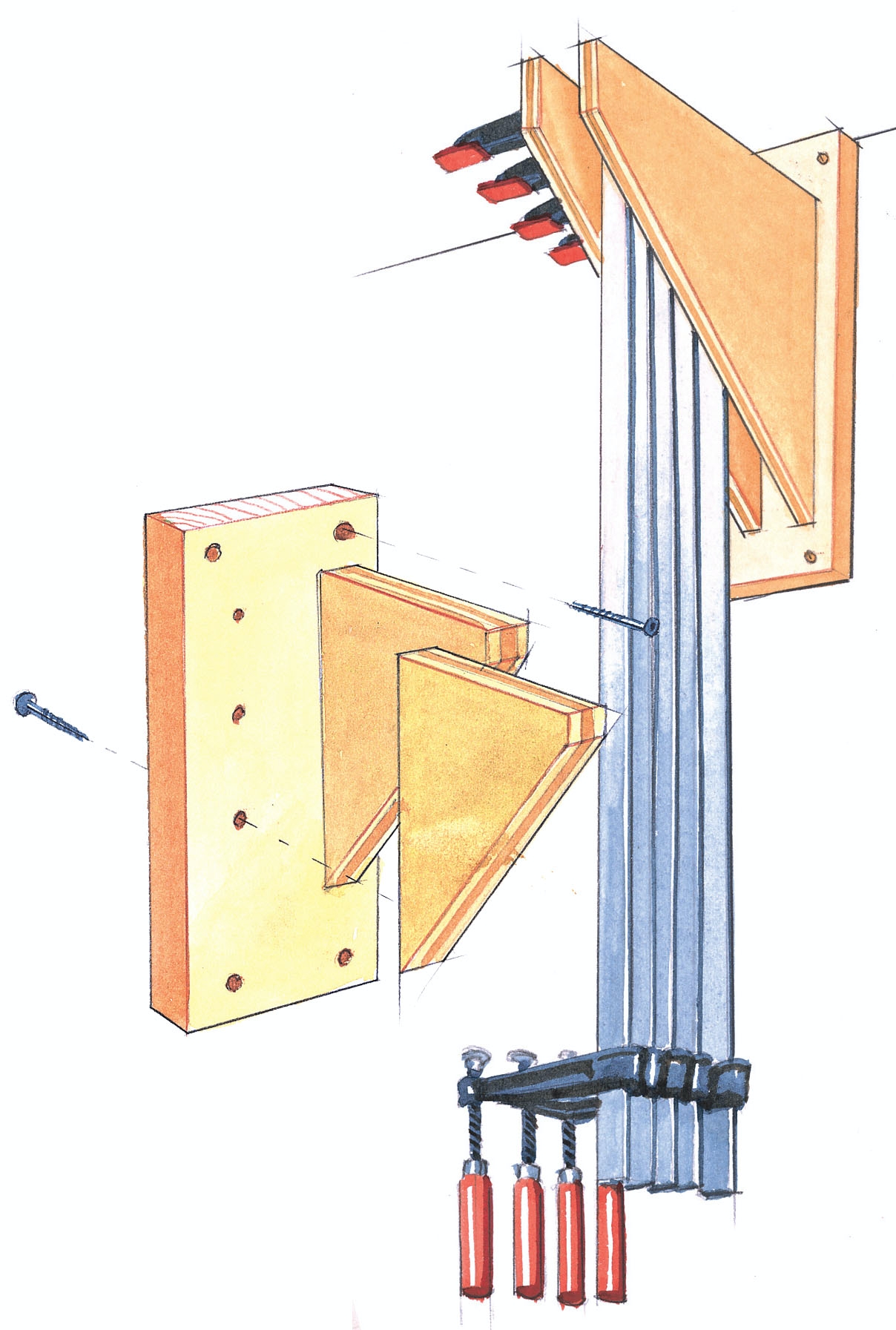 Om du inte har en ledig hylla eller ett rör att fästa dina tvingar på eller runt, kan du tillverka en liten hållare som denna. Hållaren består av en väggskiva och på den sitter två trekantiga skivor som tvingarna skjuts in på. Har du lust gör du två hållare så att du kan fäste de korta tvingarna på den ena och de långa på den andra.