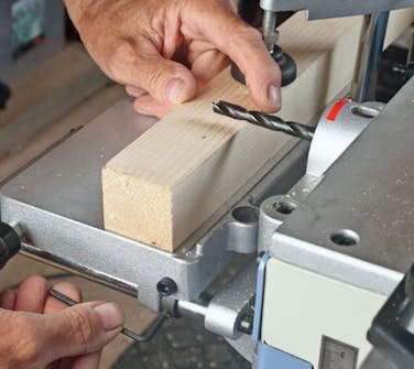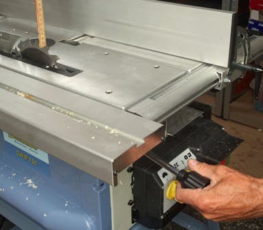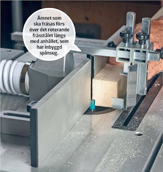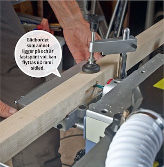 Använder undersidan av samma hyvelstål som rikthyveln använder. Genom att justera “bordet” kan du bestämma ämnets tjocklek väldigt exakt. Hyveln kan ta bort upp till 1 mm åt gången.