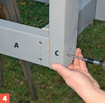 Skruva fast benen (C) i den ena ramen via ramsidorna (A). För att få en snygg finish har vi placerat skruvarna så att de sitter rakt över varandra.