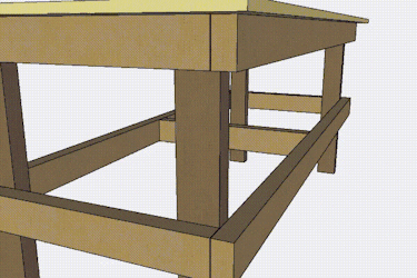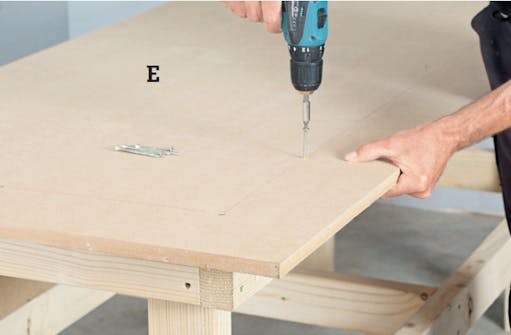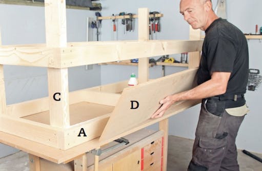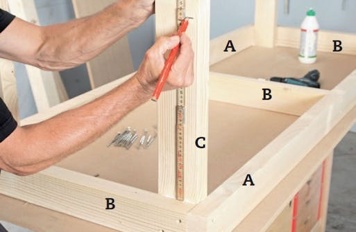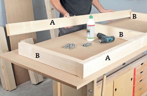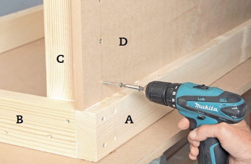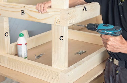 Börja med att fästa kortsidorna (B) i ramen. Sätt dem längs kanten på benen. Därefter fästs långsidorna (A), som överlappar kortsidorna. Limma fast delarna och fäst två skruvar i varje fog.
