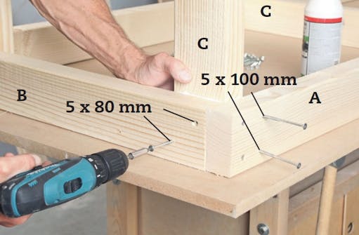 Lägg de sågade reglarna på ett plant underlag (bordsskivan). Lägg reglarna så att de bildar en ram med räta vinklar. Skruva genom långsidorna A in i kortsidorna B med två 5 x 100 mm skruvar.