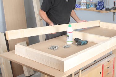 Utöver bordsskivan behöver du en cirka 30 cm bred skiva som förstärkning av underredet. Den fästs på baksidan. Börja med att såga ut delarna och se till att vinklarna blir 90 grader.