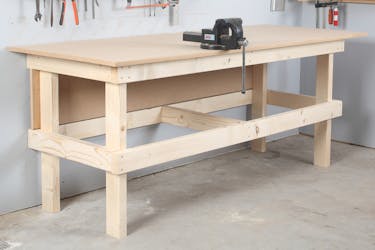Stommen till den här arbetsbänken är byggd av reglar och bordsskivan består av en MDF-skiva.