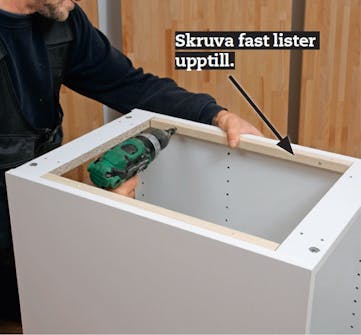 Sätt först ihop de två underskåpen, men sätt inte fast bakstyckena. Förstärk därefter ovansidan med två lister invändigt.