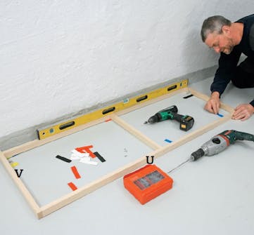 Sockeln snickras av lister (U och V). Delarna skruvas ihop. Se till att sockeln står vågrätt och fäst den på golvet med möbelvinklar och skruvar.