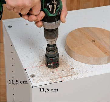 Borra hål upptill i det ena underskåpet för den genomgående skruven. Välj en hålsåg på minst 30 mm så att muttern får plats i hålet. Hålets centrum ska vara 11,5 cm från kanterna.