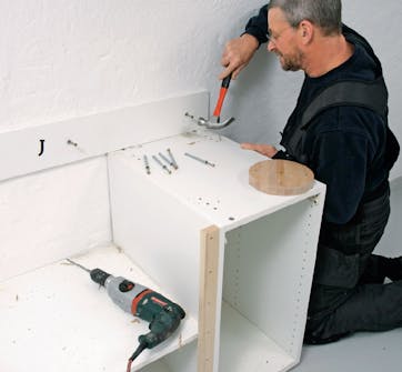 Börja med att ställa de två underskåpen på en sockel. Senare sätts de tre bänkskivorna på plats så att de stöttas i ena änden av underskåpen och i den andra av benbockar.