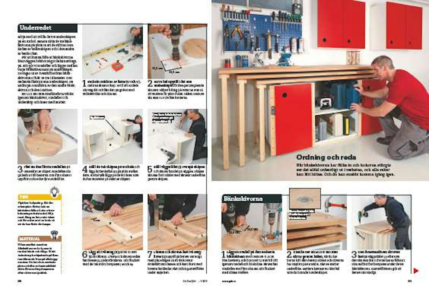 Samtliga bänkskivor är försedda med två hålrader, där hålen är 8 mm i diameter. Den främre hålraden borras 4 cm från kanten och det är 30 cm mellan hålen. Nästa rad borras 20 cm från kanten och med samma hålavstånd. Hålen i de två raderna ska vara parallella. Hålen i den övre och undre bänkskivan förses med islagsmuttrar, som knackas i underifrån. Då blir det lätt att med ögleskruvar spänna fast skivor med olika verktyg. Om du sticker ner skruvar med muttrar i hålen på skivan i mitten fungerar de som bänkhakar.
