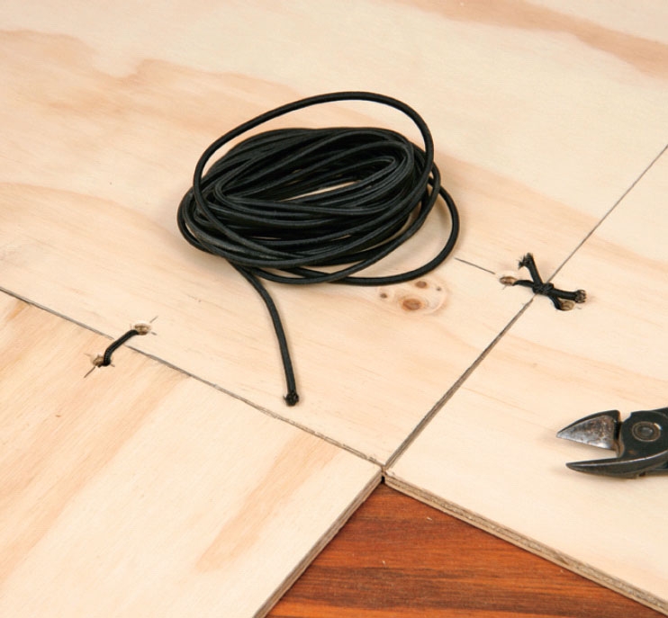 Skivorna hålls ihop med resårsnodd. Till de fasta hålen går det inte åt så långa bitar. Dra snodden genom hålen, sträck den och slå en knut. Klipp av ändarna. Till övriga hål klipper du cirka 20 cm långa bitar.