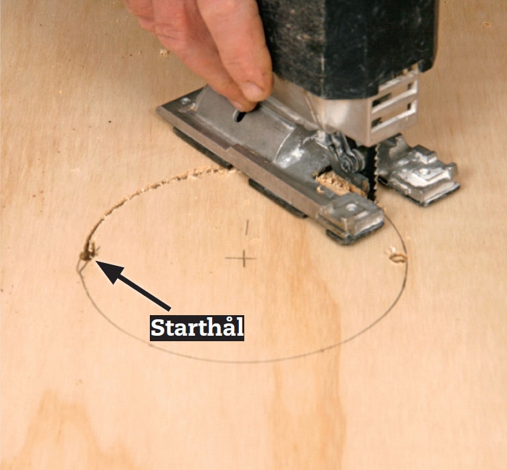Hålet för flexslangen sågas med sticksåg mitt på bakstycket. Då kan du senare välja om boxen ska stå upp eller ligga ner. Hålet ska passa till den krage och slang du väljer. Starta med att borra ett 8 mm hål, som sågbladet kan stickas ner i.
