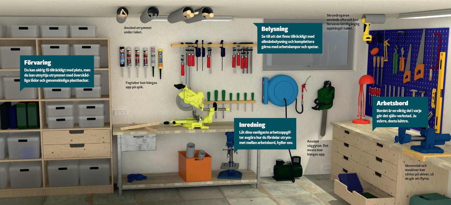 En hylla ger bättre överblick än lådor och stängda skåp. Det är inte snyggt men praktiskt, och det är syftet med verkstaden. Det känns skönt att få bort saker från golvet och upp i ögonhöjd.