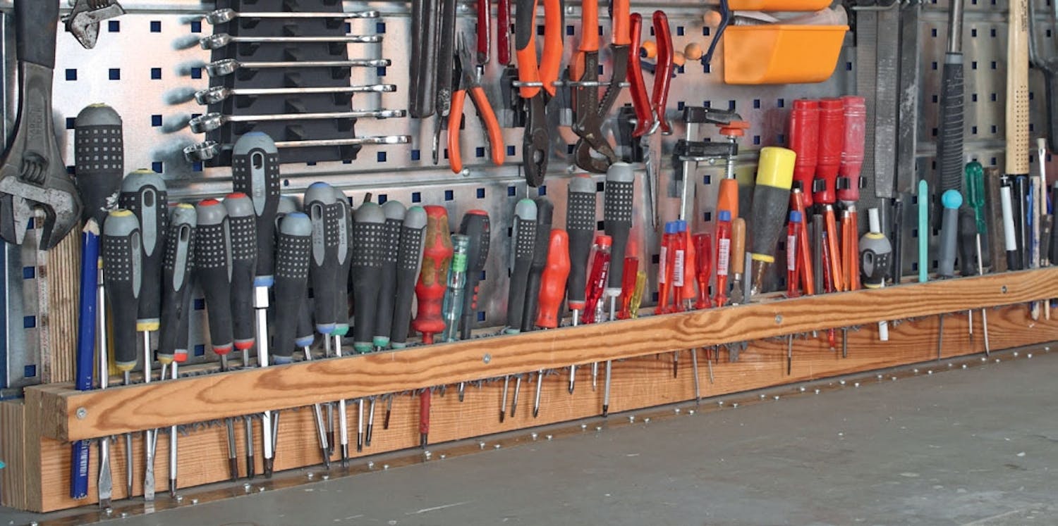 Använd flera sorters hållare. Redskap utan hål i skaftet kan sättas fast i hållare som klämmer fast om skaftet.