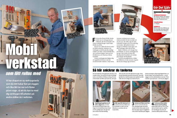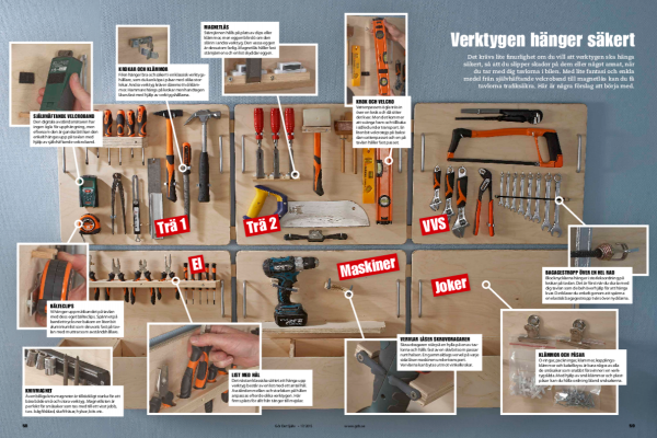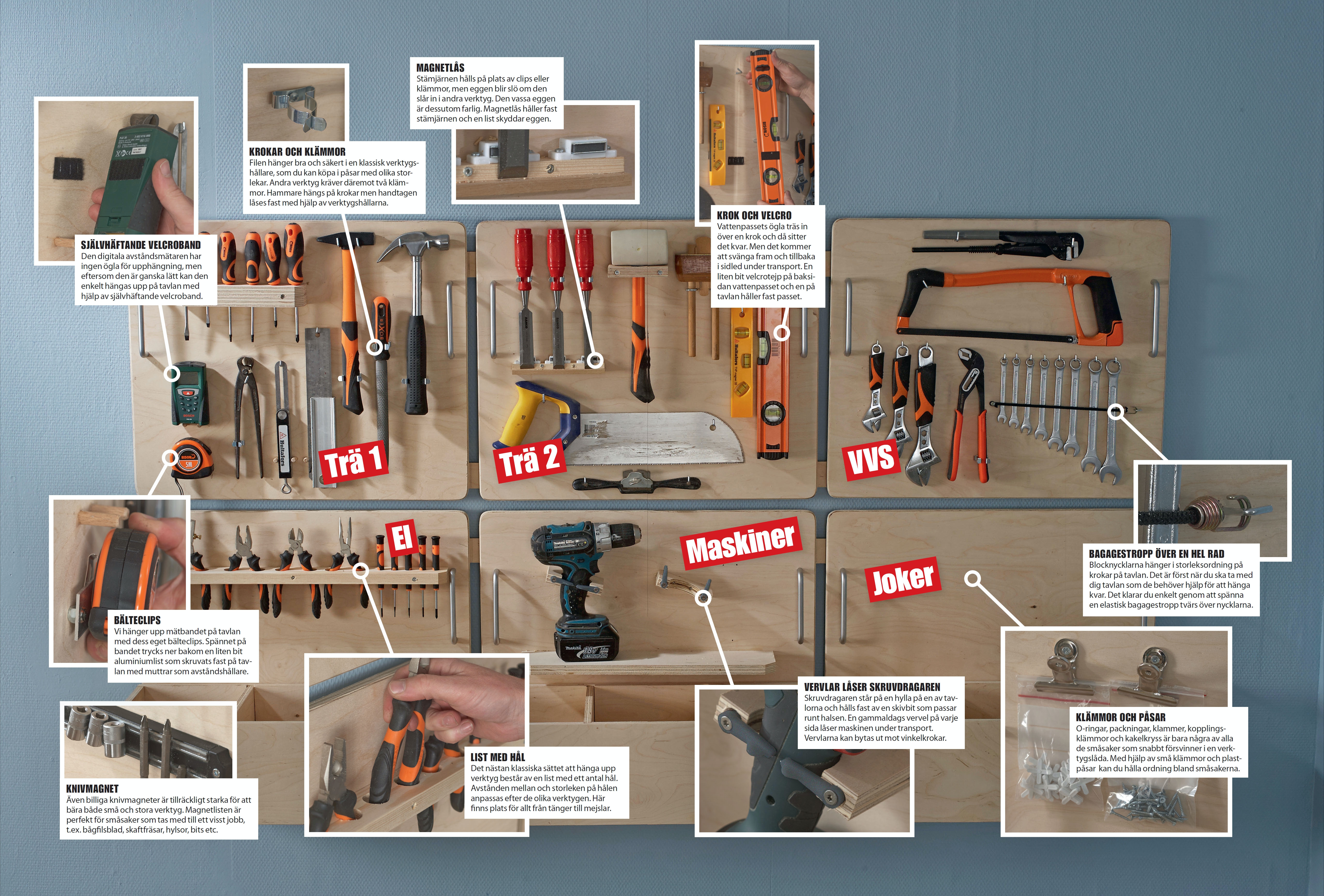 Den kompletta verktygstavlan består av sex mindre tavlor. Du snickrar förstås så många tavlor som behövs till dina verktyg. Du kan också ändra storleken på tavlorna, men gör dem inte för stora för då blir de tunga. Vi har använt björkplywood till våra tavlor, men det går lika bra med furuplywood, spånskiva eller mdf. Det är en fråga om smak och pris. Tavlorna hänger på geringssågade lister, s.k. french cleats, som används parvis - en på väggen och en på baksidan av tavlan. Vi har två lister på varje tavla - och två på väggen.