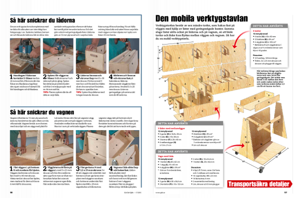 Vagnen tillverkas av 15 mm plywood och även nu bestämmer du själv vilken sort du vill använda. Vagnen består av en botten med stora hjul och en vägg med plats för två tavlor. Dessa sätts fast på vagnens vägg på samma sätt som på väggen i verkstan. Avståndet mellan listerna ska därför vara lika stort som på verkstadsväggen. Placera vagnens vägg mitt på bottnen så att lådorna inte sticker utanför. De två gavlarna förstärker konstruktionen och formen på dem gör det lätt att komma åt verktygen.