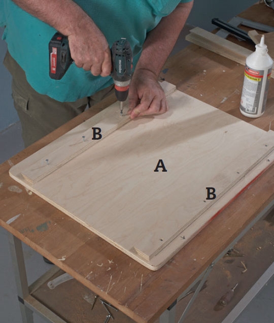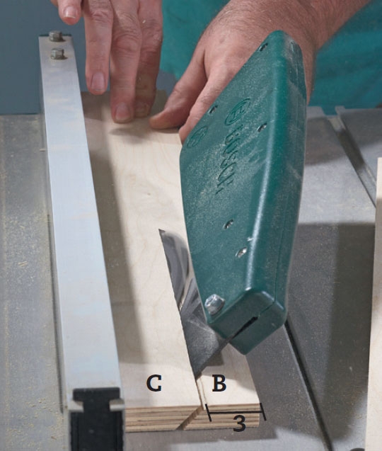 Upphängningslisterna B och C sågas ut ur 15 mm plywood. 9 cm breda lister klyvs med ett 45-gradigt spår. Det görs lättast med en bordscirkelsåg.