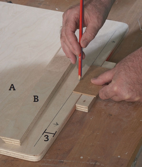 Mät upp för listerna B på tavlorna. Det är enklast om du använder en mall, som du tillverkar av en kloss och en masonitbit.