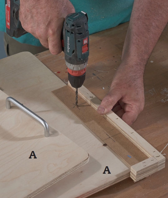 Handtagen i lådornas kortsidor D fräses med en 22 mm notfräs. Eftersom det ska fräsas sex likadana urtag lönar det sig att snickra en fräsmall. Då blir handtagen också likadana.