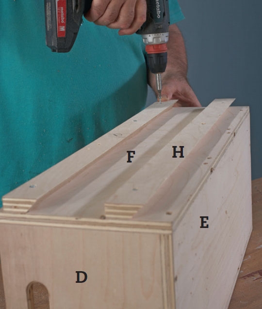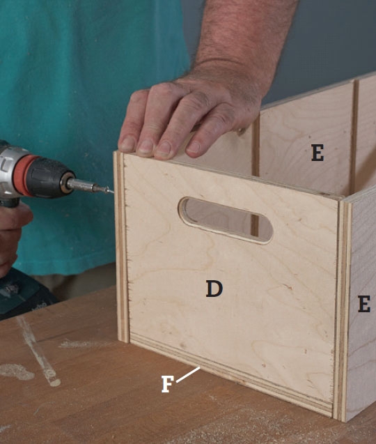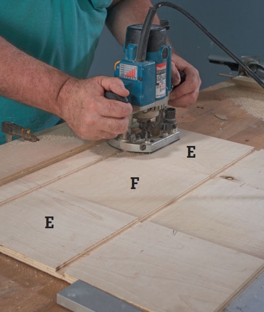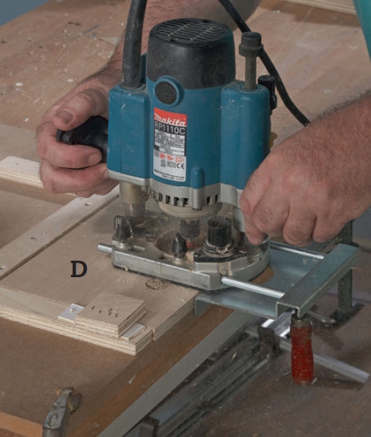 Spåren för väggarna fräses i lådbottnarna F och sidorna E på en gång. Spänn fast delarna på arbetsbordet och fräs 6 mm djupa spår med en 14 mm notfräs.