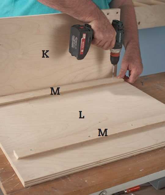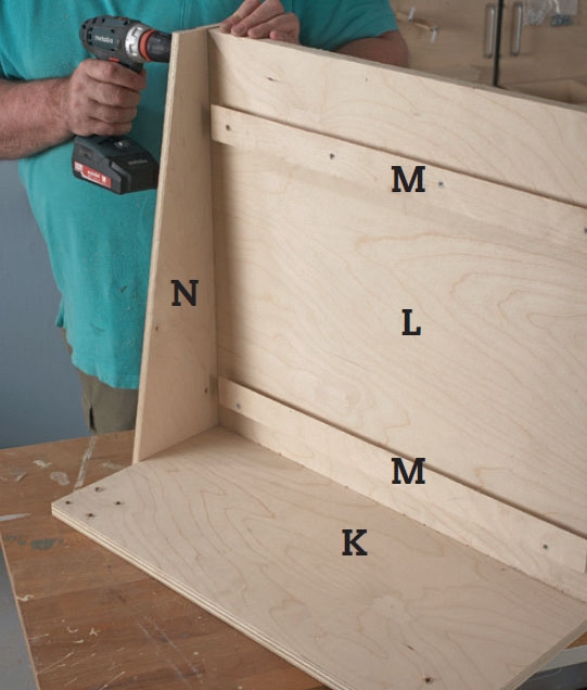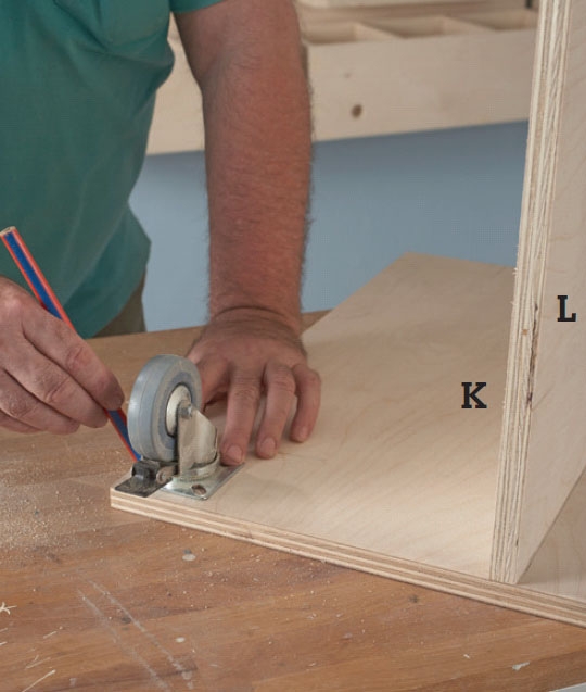 Fäst väggen L på bottnen K och markera för hjulen. Väggen ska limmas och skruvas fast med 4 x 40 mm skruvar. Vänta med att skruva fast hjulen, men markera för dem och borra 6 mm hål för skruvarna.