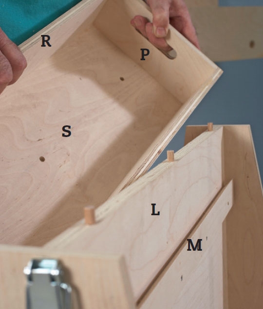 De sex verktygstavlorna kompletteras med tre lådor för alla saker som inte riktigt kan hängas upp, t.ex. batterier, laddare, borrsatser och liknande. Lådorna blir en del av den samlade verktygstavlan eftersom de hakas fast nertill på de tre undre tavlorna. Och det görs också med geringssågade lister. Lådorna görs av 12 mm plywood och i varje kortsida fräses urtag till stora handtag. För att hålla ordning bland alla små saker förses varje låda med väggar som kan skjutas ner i spår, som fräses 14 mm breda.